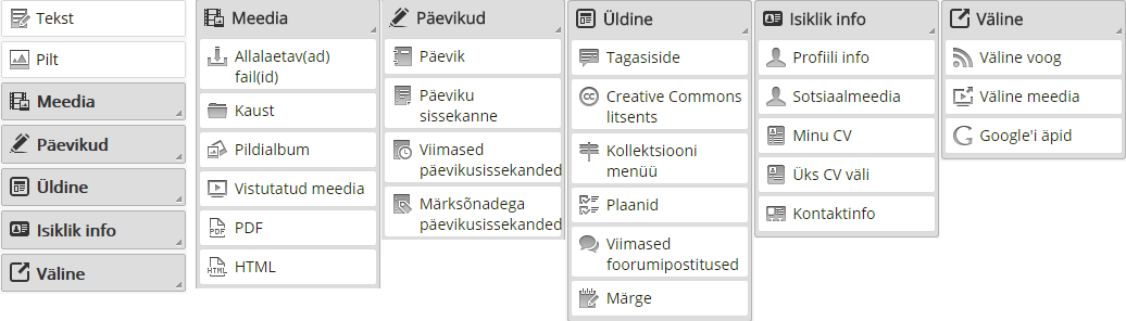 Täitke leht sisuga lisades vajalikke plokke: alamenüüs Muuda sisu (vt Mahara plokid)